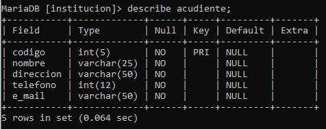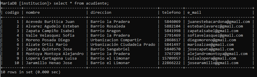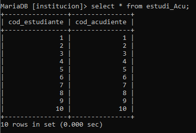 Una escuela de básica secundaria desea sistematizar el proceso interno del manejo de la matrícula, para lo cual requiere que se le construya una BD que permita almacenar del estudiante(código, nombre, dirección, teléfono, acudiente, email) tenga presente que un acudiente puede representar varios estudiantes.