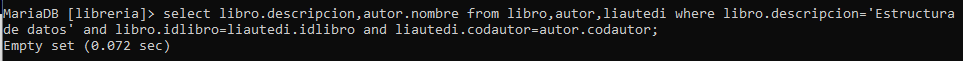 No entrega ningún resultado ya que el libro nombrado 'Estructura de datos' no se encuentra registrado a ningun autor como se muestra a continuación