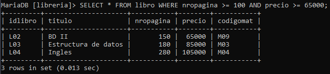 M. Realizar una consulta que visualice la información de los libros que tengan a partir de 100 páginas y su precio sean mayor o igual a 65000.