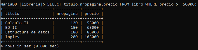 O. Crear una consulta que visualice descripción, número de páginas y precio de los libros cuyo precio sea mayor a 50000 pesos.