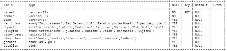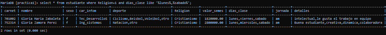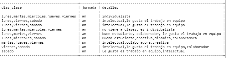 - Estudiantes que ven clase lunes y sábado: dias_clase like '%lunes%,%sabado%'