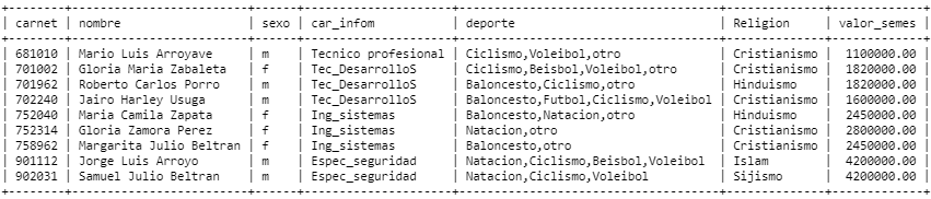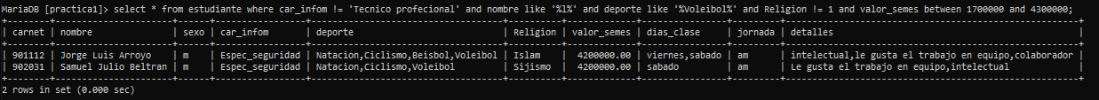 Sintaxis: select * from estudiante where car_infom != 'Tecnico profecional' and nombre like '%l%' and deporte like '%Voleibol%' and Religion != 1 and valor_semes between 1700000 and 4300000;
