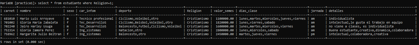Sintaxis: select * from estudiante where Religion=1;