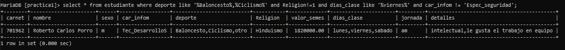 Sintaxis: select * from estudiante where deporte like '%Baloncesto%,%Ciclismo%' and Religion!=1 and dias_clase like '%viernes%' and car_infom != 'Espec_seguridad';