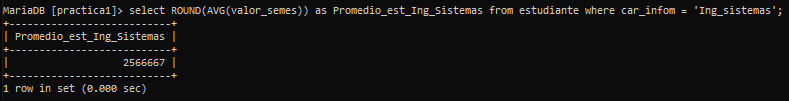 Sintaxis: select ROUND(AVG(valor_semes)) as Promedio_est_Ing_Sistemas from estudiante where car_infom = 'Ing_sistemas';
