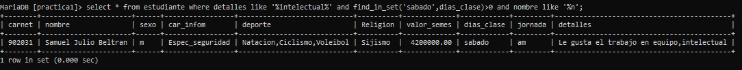 Sintaxis: select * from estudiante where detalles like '%intelectual%' and find_in_set('sabado',dias_clase)>0 and nombre like '%n';