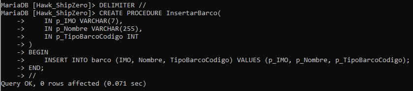INSERT INTO barco (IMO, Nombre, TipoBarcoCodigo) VALUES (p_IMO, p_Nombre, p_TipoBarcoCodigo);
