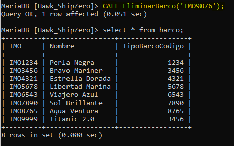 Análisis: Este procedimiento almacenado se llama EliminarBarco y toma un parámetro p_IMO que representa el número IMO del barco que deseas eliminar. Cuando llames a este procedimiento con un número IMO válido, eliminará el registro correspondiente de la tabla "barco".