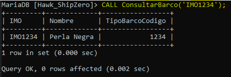 Análisis: Este procedimiento almacenado se llama ConsultarBarco y toma un parámetro p_IMO que representa el número IMO del barco que deseas consultar. Cuando llames a este procedimiento con un número IMO válido, recuperará y mostrará la información del barco desde la tabla "barco".