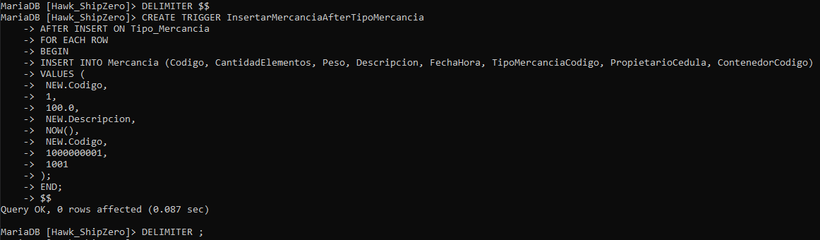 Análisis: Este trigger se activará después de insertar un nuevo registro en la tabla "tipo_mercancia" y creará automáticamente una nueva fila en la tabla "mercancia" utilizando los valores del nuevo tipo de mercancía.