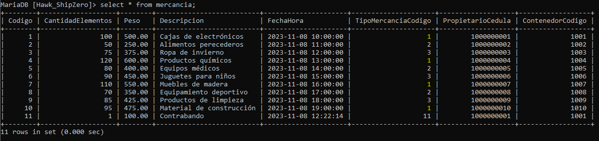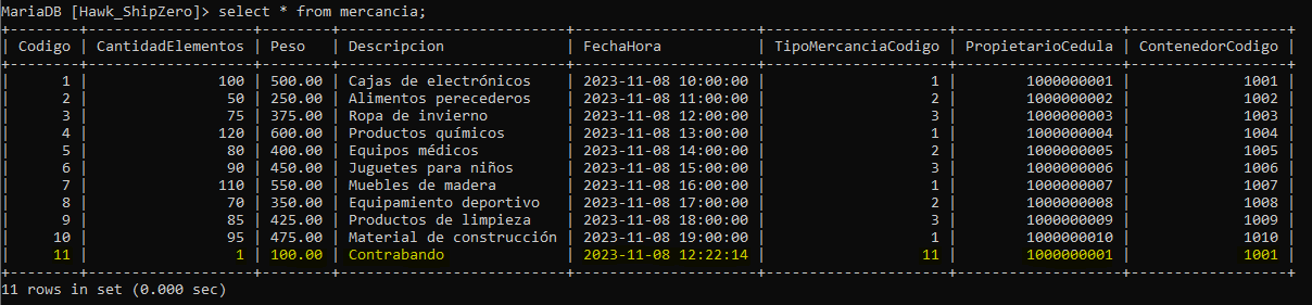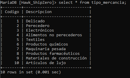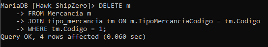 - Luego, utilizamos una cláusula WHERE para especificar que solo queremos eliminar los registros donde el valor de "Codigo" en la tabla "tipo_mercancia" sea igual a 1.