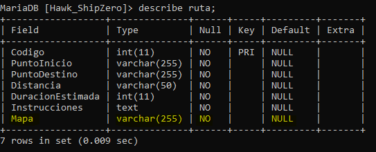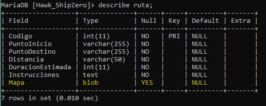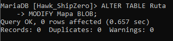 Análisis: Esta declaración cambiará el tipo de datos del campo "Mapa" a BLOB en la tabla "Ruta", Se utiliza este tipo de datos cuando se necesita almacenar imágenes, sonidos o textos muy largos.