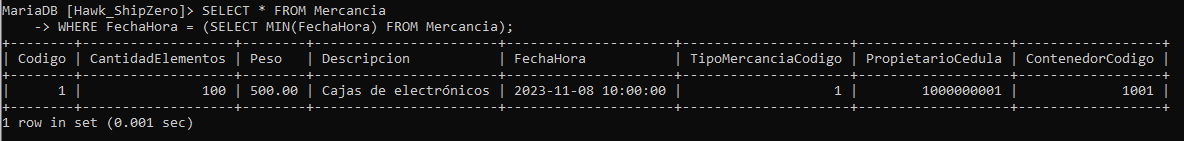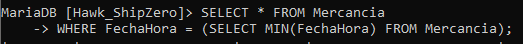 WHERE FechaHora = (SELECT MIN(FechaHora) FROM Mercancia);